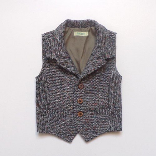 Dandy tweed waistcoat in a slate/olive herringbone tweed with flecks of ocra, blue and green, taupe / brown satin back with adjustable buckle - two front pockets - 4 coconut butons - 25% wool, 40% acrylic, 30%, 5% other, polyester satin lining - machine washable at 30 degrees