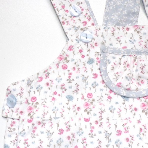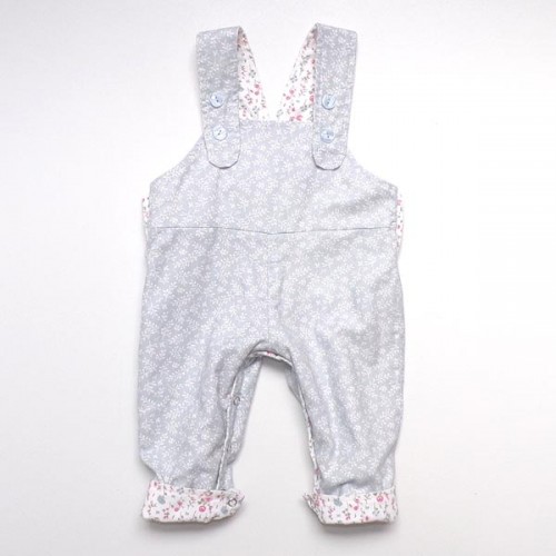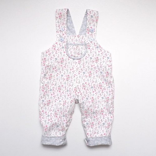 Rose reversible coat in a fine cotton needlecord - pink rose and blue bud design on a cream background, reversed with a soft, dusty pink heringbone cotton. Beautiful quality fabric - adjustable button fastening and poppers for nappy changes - patch pocket on bib - 100% cotton - machine washable at 30 degrees
