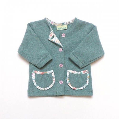 Sage green cardigan in sof cotton knit with a floral cotton trim - two patch pockets - 70% cotton, 19% polyacrylic , 7% viscose, 4% elastine - machine or hand wash