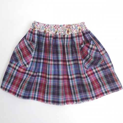 Reversible skirt in a wam cotton floral design reversed with blue and red cotton check - 2 patch pockets on each side - elasticated waist - 100% cotton - machine washable