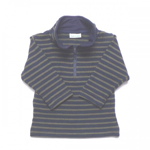 Navy and olive stripe top in a soft cotton mix knit, with collar and half zip * 70% cotton, 19% polyacrylic, 4% elastin, 3% viscose, 4% polyamide * machine washable at 30 degrees